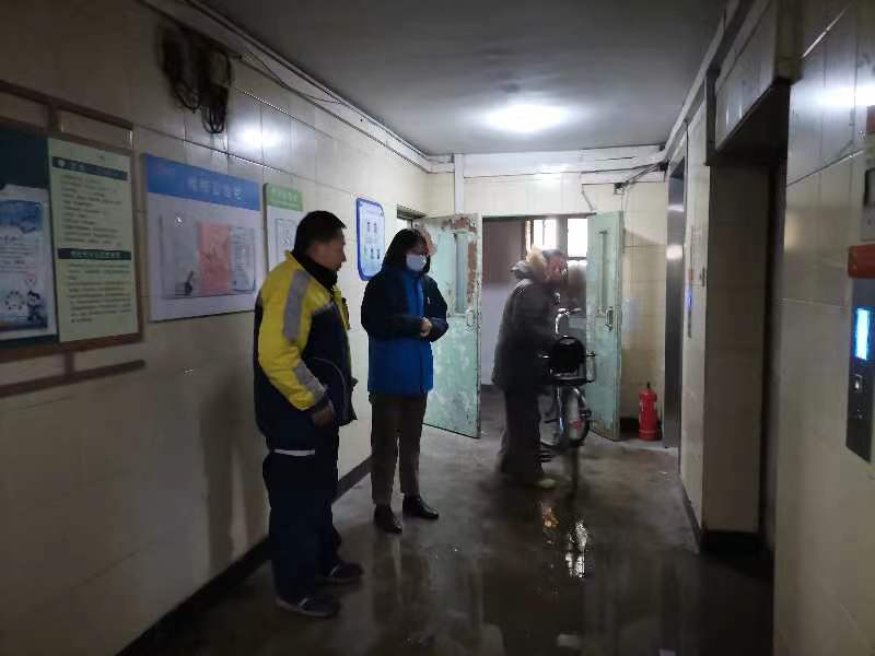 节日的余温还未散去,华严北里社区全体社工收心聚力以奋进正当时的姿态迎接新一年的为民服务。上班第一天,社区党委书记郝倩怡带领社区工作人员开始进行辖区内安全巡查。在巡查到63号楼时发现一层消防栓漏水,楼道已经开始积水。社工迅速联系物业人员要求尽快来现场处理,同时在居民群内发布安全提示,提醒过往居民绕行,以防地滑摔伤。 经过半小时的努力,消防栓漏水点被堵住,积水清扫完毕,地面恢复干爽。