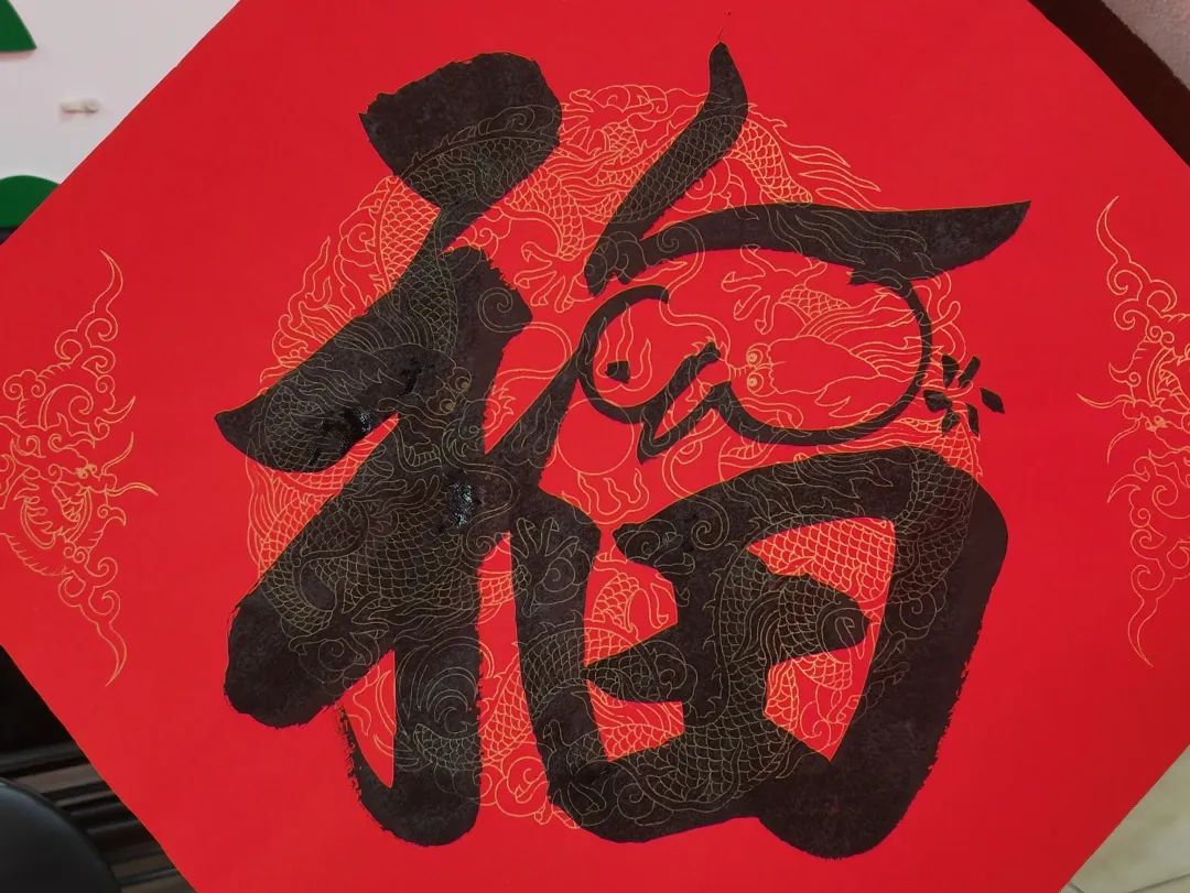 泼墨造物,笔下生花,学生们各显身手,将可爱的兔子融入到“福”字中,用笔尖传递新春的祝福。叔叔阿姨们也不甘示弱,用金墨写在大红的纸面,金光闪烁,高贵华丽又接贯地气。
