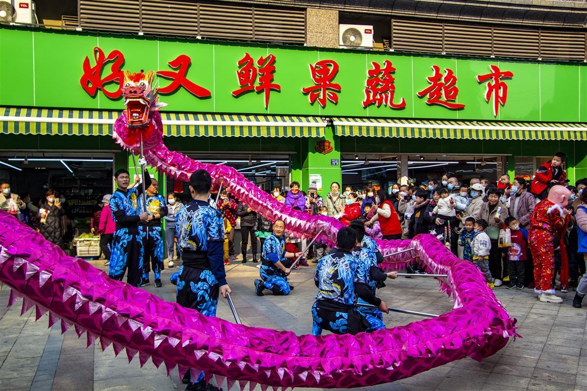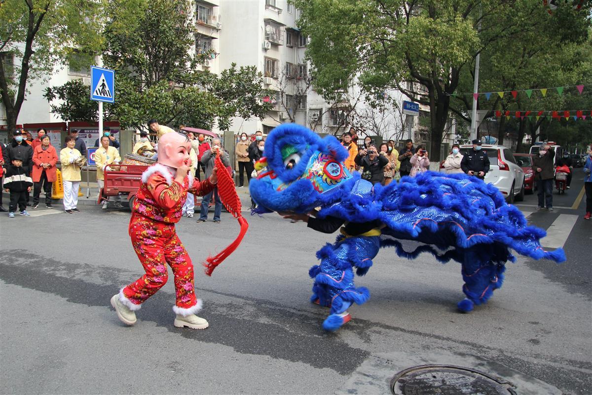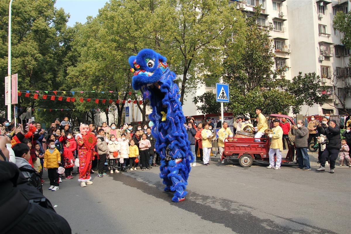 2023年2月1日正月十一,武汉市东西湖区常青花园社区举办“2023年龙腾狮舞贺新春”巡游展演活动。时隔三年,欢乐和喜悦的年味再次溢满常青花园的大街小巷。在龙狮贺新春展演中,随着铿锵有力、热闹非凡的锣鼓声响起,舞龙和舞狮各展绝技,只见活灵活现的蓝色狮子腾翻、扑跌、跳跃,或精神抖擞,或憨态可掬,各种神态惟妙惟肖,把传统的狮舞采青展现得淋漓尽致。一条玫红色的龙精气神十足,使出穿、腾、跃、翻,滚、戏、缠等舞龙绝技,灵动地展现了龙的神韵。展演过程中高潮迭起,精彩的龙狮表演博得现场居民的阵阵喝彩。