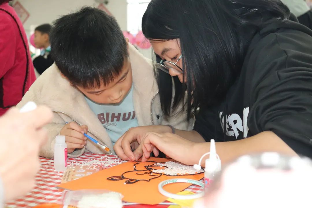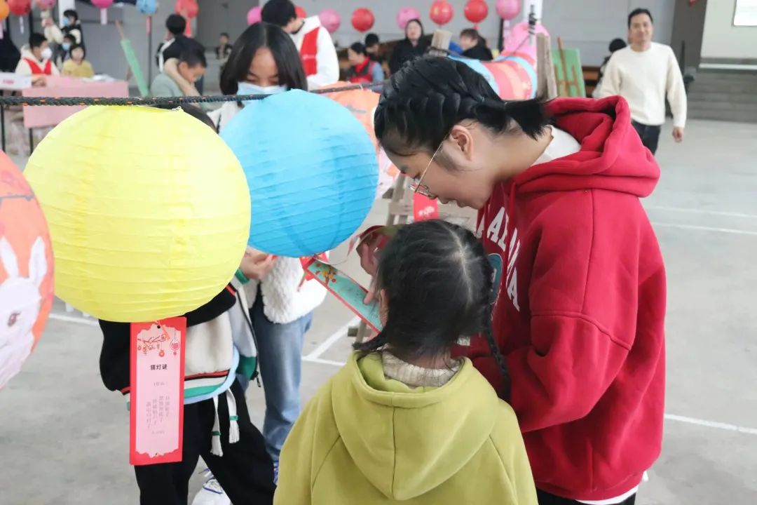 完成了灯谜挑战,便可兑换手工材料包。实践,必定是集中孩子们注意力、提升孩子们动手能力的良方!平日再调皮的孩子,也会在手工中表现出他们专注的一面。有些孩子缺乏耐心,志愿者们会耐心引导,并辅助其一同完成手工作品,小伙伴之间也会积极协作。