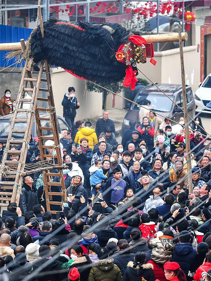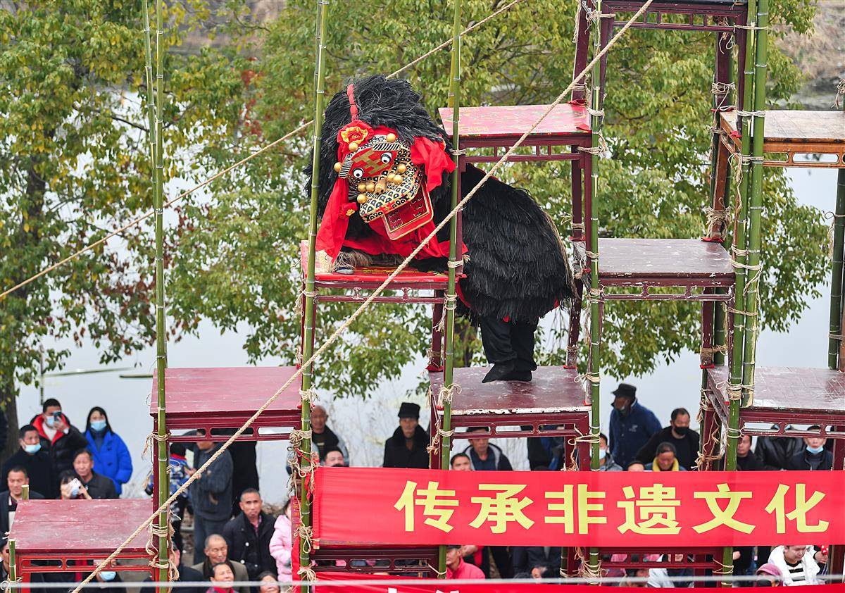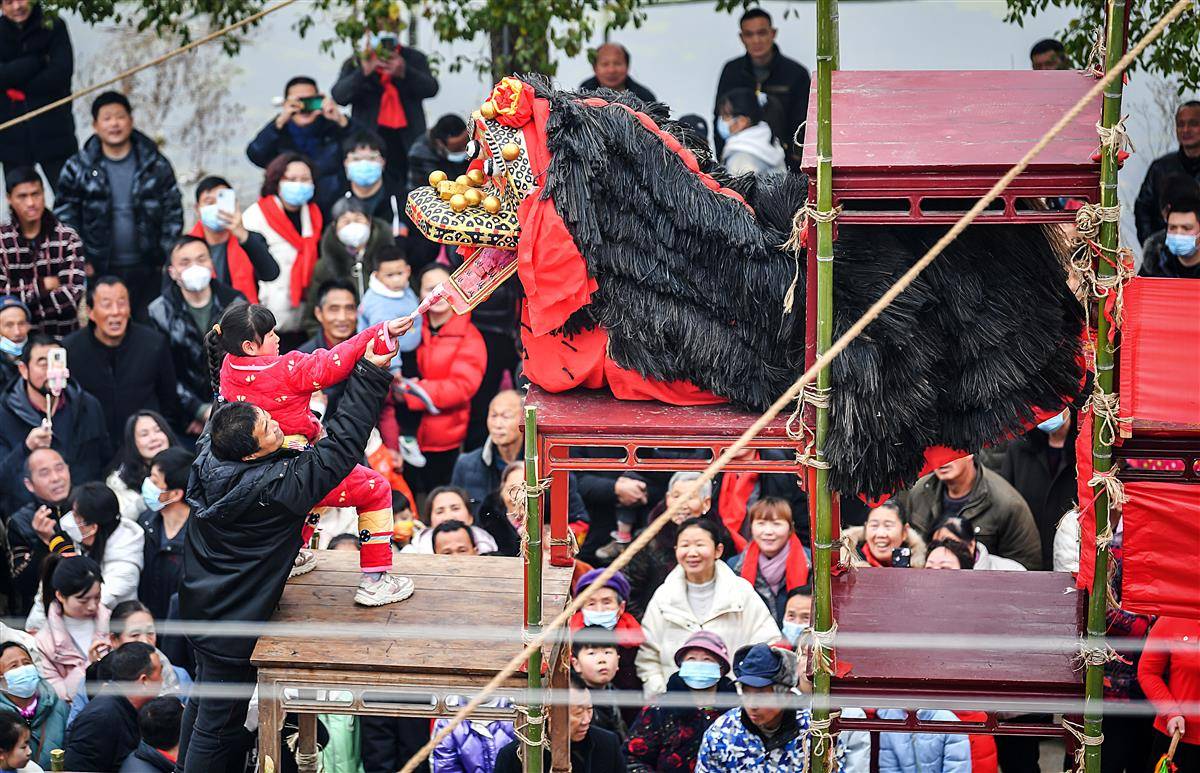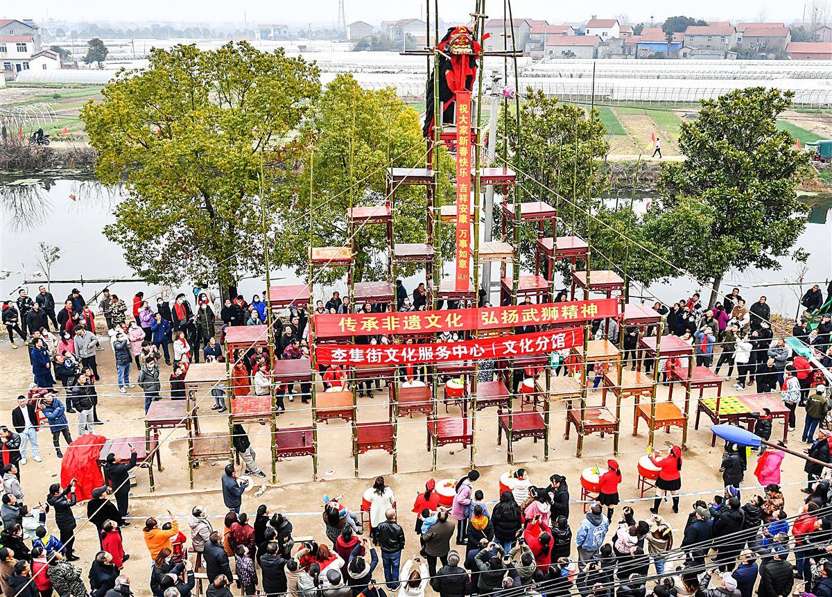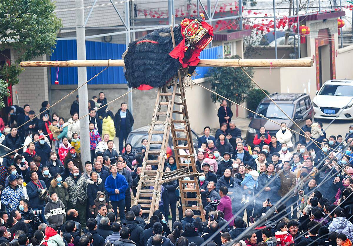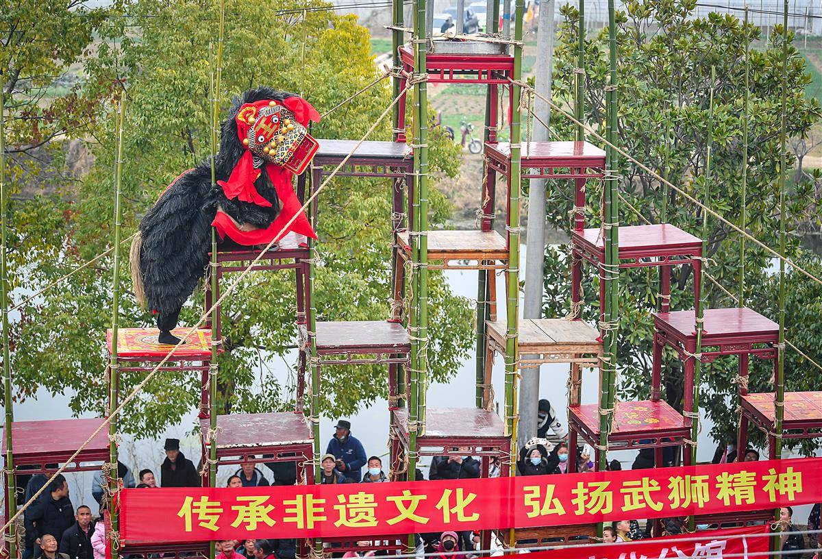 2月5日上午,54张八仙桌垒起十层高台,第十八代非遗传人施金星和施春发舞着狮子从底层穿梭至台顶,衔大礼、吐标语、玩绣球、站梅花桩…当日是传统元宵佳节,武汉市新洲区李集街张集村施家湾热闹非凡,近千名村民搭台、擂鼓、助威,倾力助演民间绝活——高台狮子,全湾人及周边村民热热闹闹庆元宵。