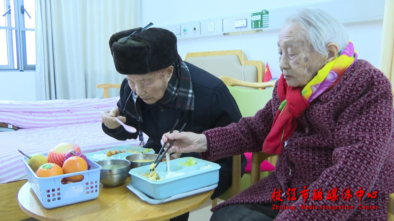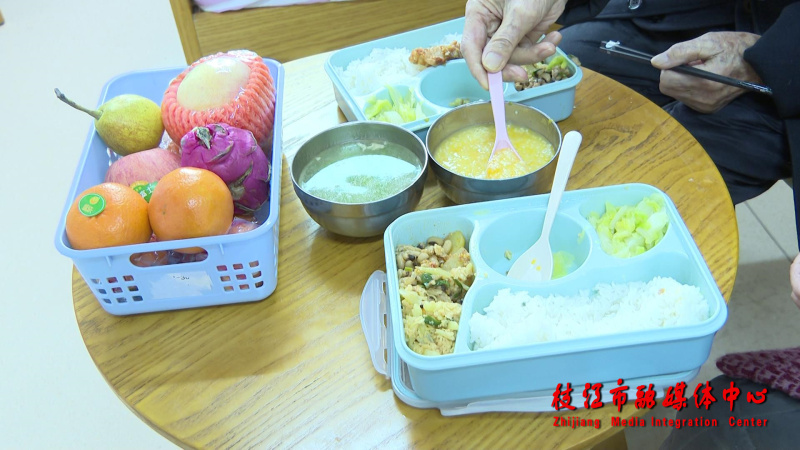 临近午饭时间,医养中心医护人员为李德祥老人送来了种类丰富的营养膳食,主食、蔬菜、水果、肉类应有尽有,陪伴在其左右的老伴不时为他夹菜,场景温馨和谐。
