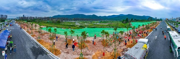 活动现场,蓬江区四套班子领导率先垂范,干部群众、各界社会代表和少先队员们踊跃参与,三五人一组协作配合,撸起袖子弯下腰,挥锹挖土,放苗围堰,提水浇灌,合力栽下了海南红豆、秋枫等一大片乡土阔叶树种,连排的苗木矗立在绿道上,焕发出勃勃生机。