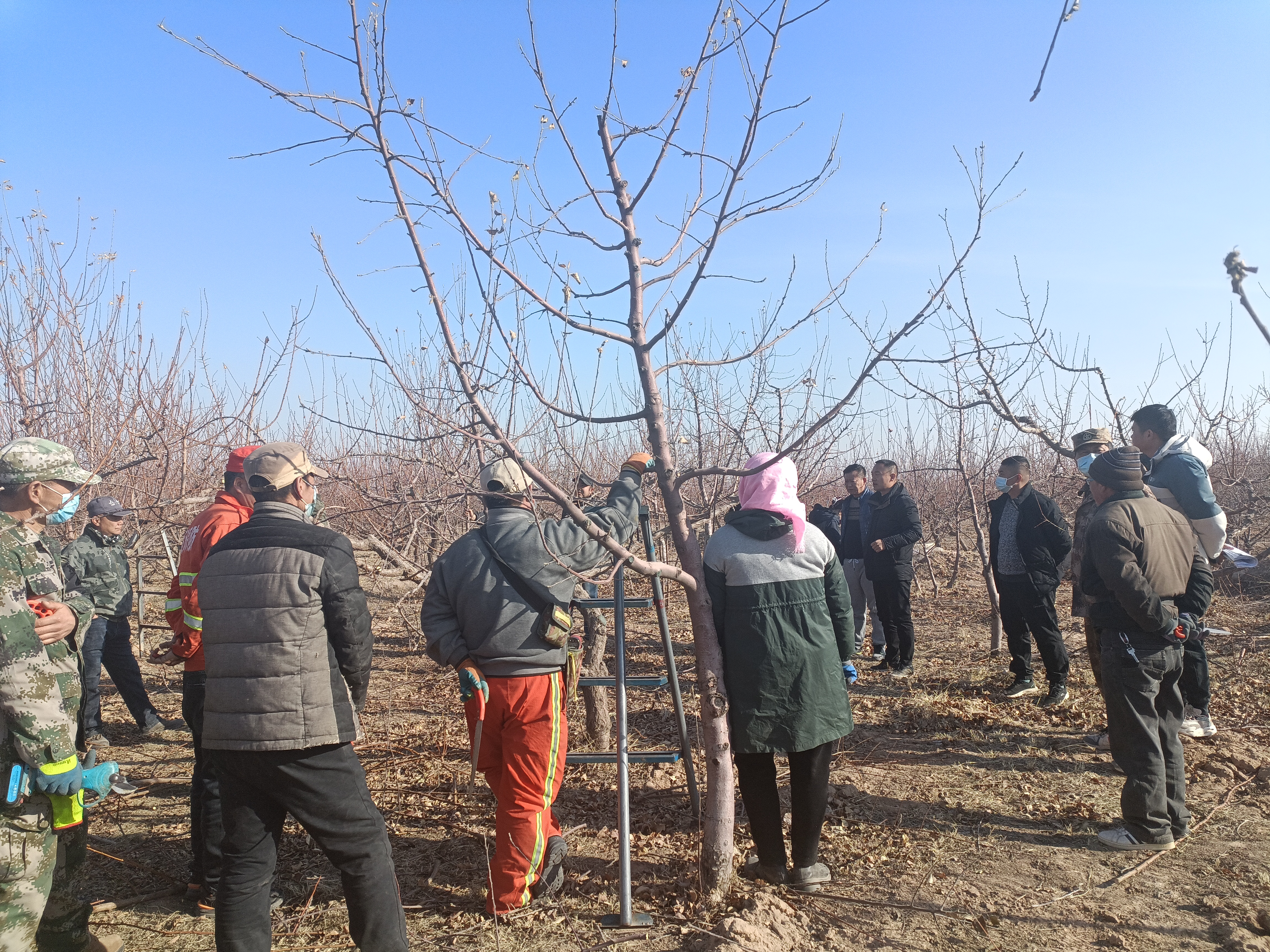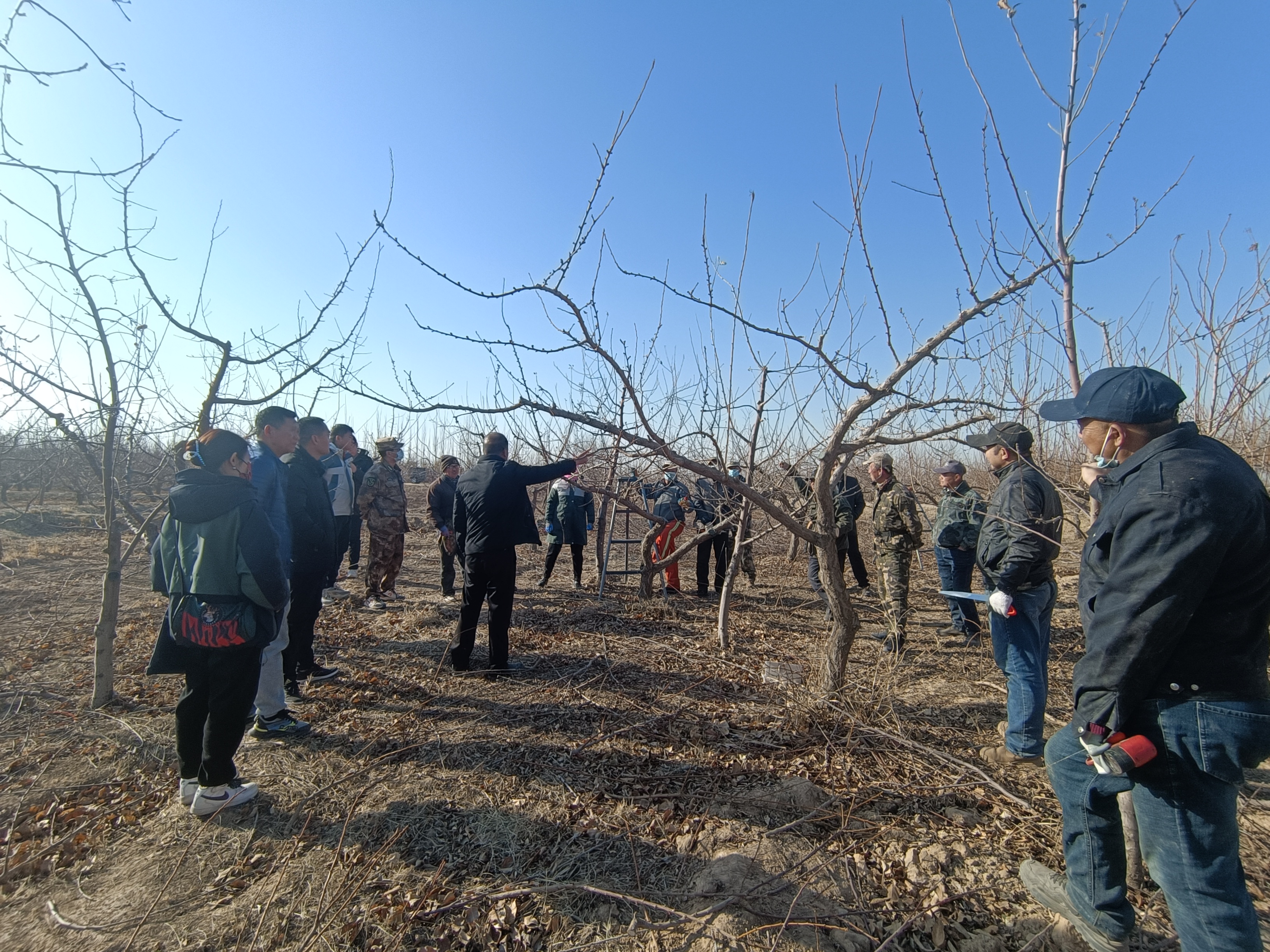 在马鞍山管理站,马克功从树体结构、树形培养、主枝选留、通风透光、枝组更新等五个方面进行示范操作,同时要求抢抓季节,尽快完成修剪任务,及时做好涂抹剪锯口、清园除杂、喷打石硫合剂等工作。