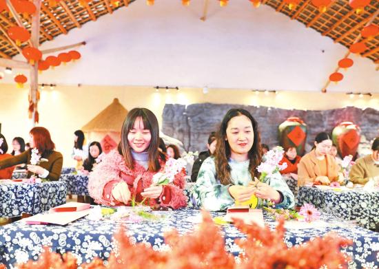 学插花 3月7日,大足区文化馆在回龙镇新时代文明实践所举办“三八”妇女节花艺培训活动,邀请专业的花艺老师,从选花、裁剪、造型等多方面为女性同胞讲解插花技巧。大家相互协作,一展手艺,一支支鲜艳的花朵在大家的巧手下组成了千姿百态的花篮,处处洋溢着温馨和喜悦。?新渝报记者黄舒摄赏花