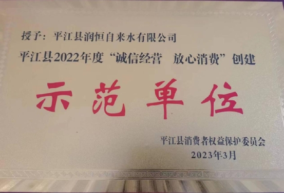 县润恒自来水有限公司:获评“诚信经营放心消费”创建示范单位