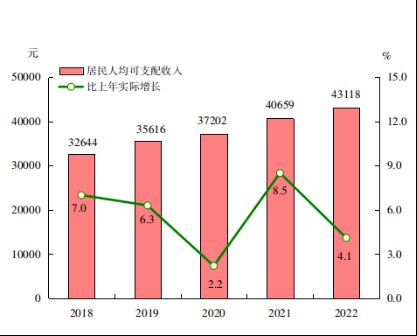 图10 2018-2022年居民人均可支配收入及其实际增长速度