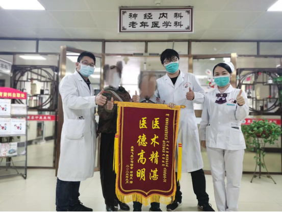 近日,痊愈出院的郑阿婆及家属来到鹿寨县中医医院神经内科,将一面印有“医德高明,医术精湛”字样的锦旗,赠送给鹿寨县中医医院神经内科表示感谢。
