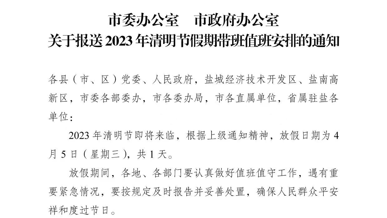 市委办公室 市政府办公室关于报送2023年清明节假期带班值班安排的通知