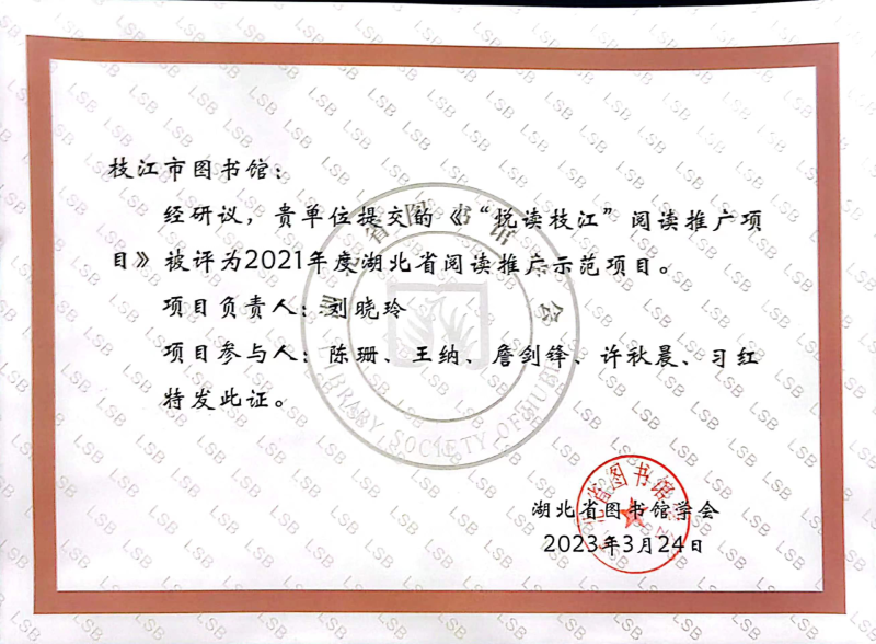 喜讯!“悦读枝江”荣获湖北省阅读推广示范项目