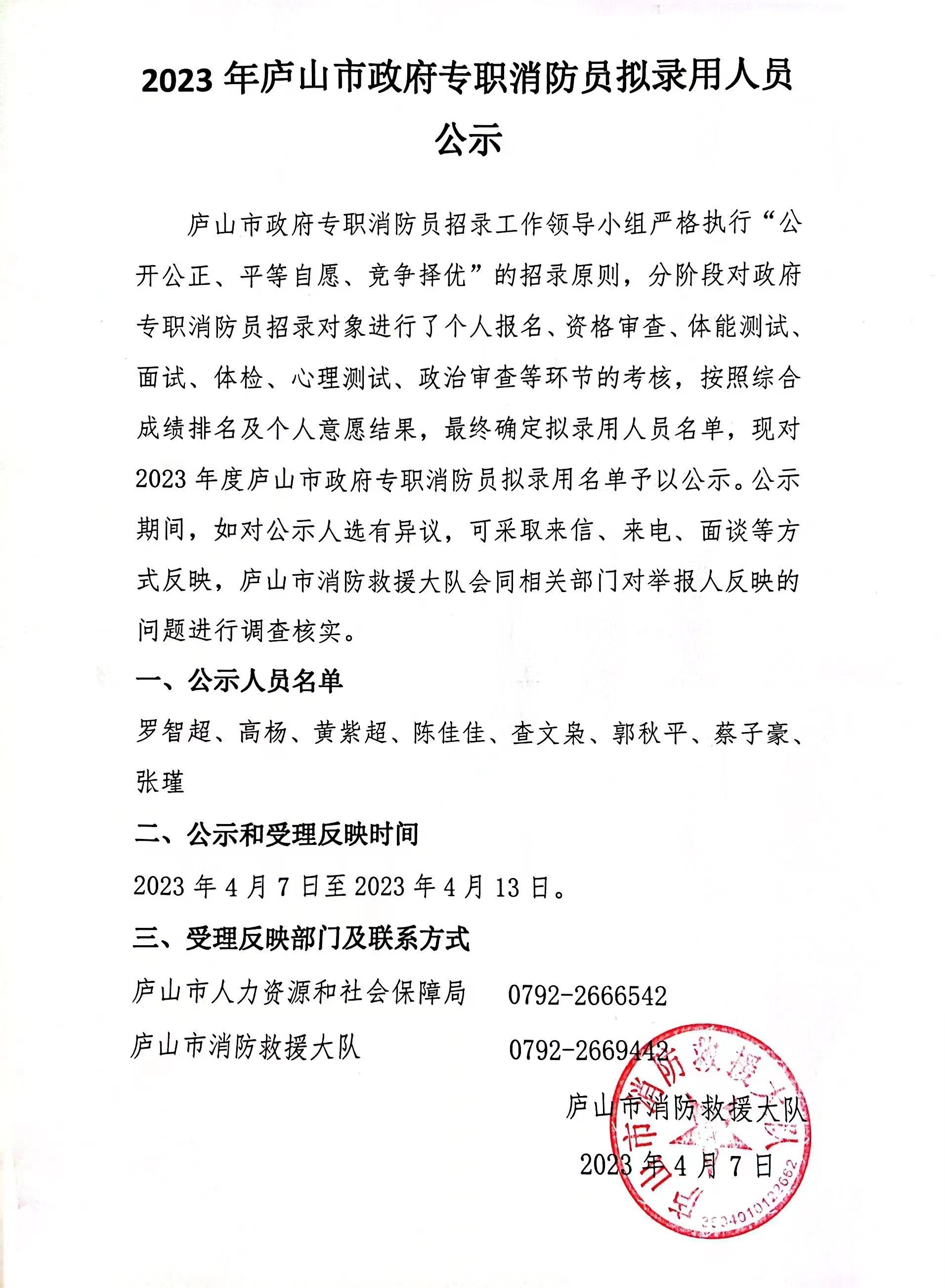 2023年庐山政府专职消防员拟录用人员公示