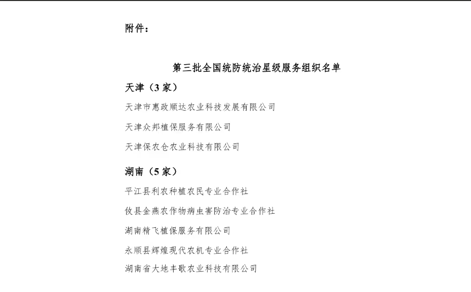 近日,中国农业技术推广协会公布了“第三批全国统防统治星级服务组织”名单,我县“平江县利农种植农民专业合作社”榜上有名!这是我县农业农村工作植保领域继“全国农作物病虫害统防统治百强县”“全国农作物病虫害绿色防控整建制推进县”后,又获评的一个全国性称号。