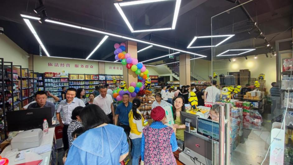 开业仪式合影积分超市货架上物品琳琅满目、摆放有序,销售商品包括粮油、酒水、文具、日用百货等各类物品3000余个品种。开业当天,四方来客纷纷排队选购各类生活用品和粮油副食,现场人气爆棚、热闹非凡。下溪镇共和街社区党支部书记、鑫福商贸法人易上文激动说到,经过前期的宣传发动,开业当天超市营业额超过6万元,全年营业额预计将超过500万元。