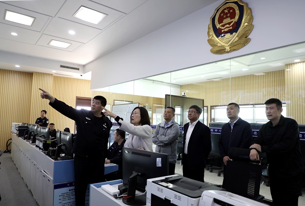 在怀柔公安分局指挥大厅通过视频系统检查调度城市运行、交通保障和景区秩序等情况