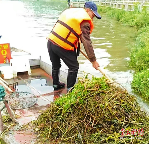 在湘江西岸风光带石鼓书院段,打捞人员驾驶小船打捞水上漂浮垃圾,开展保洁作业。连场暴雨过后,河道漂流下来的水草杂物和白色垃圾较多,水上环卫作业班组任务繁重。假日期间,增加了3艘打捞船和10名打捞作业人员,水上垃圾打捞量是平时的3倍以上。市环境卫生事务中心负责人要求水上环卫作业班组发扬吃苦耐劳、拼搏奉献的精神,充分发挥市“工人先锋号”示范、引领、带动和激励作用,加强打捞作业和安全生产,确保江河水面干净整洁。