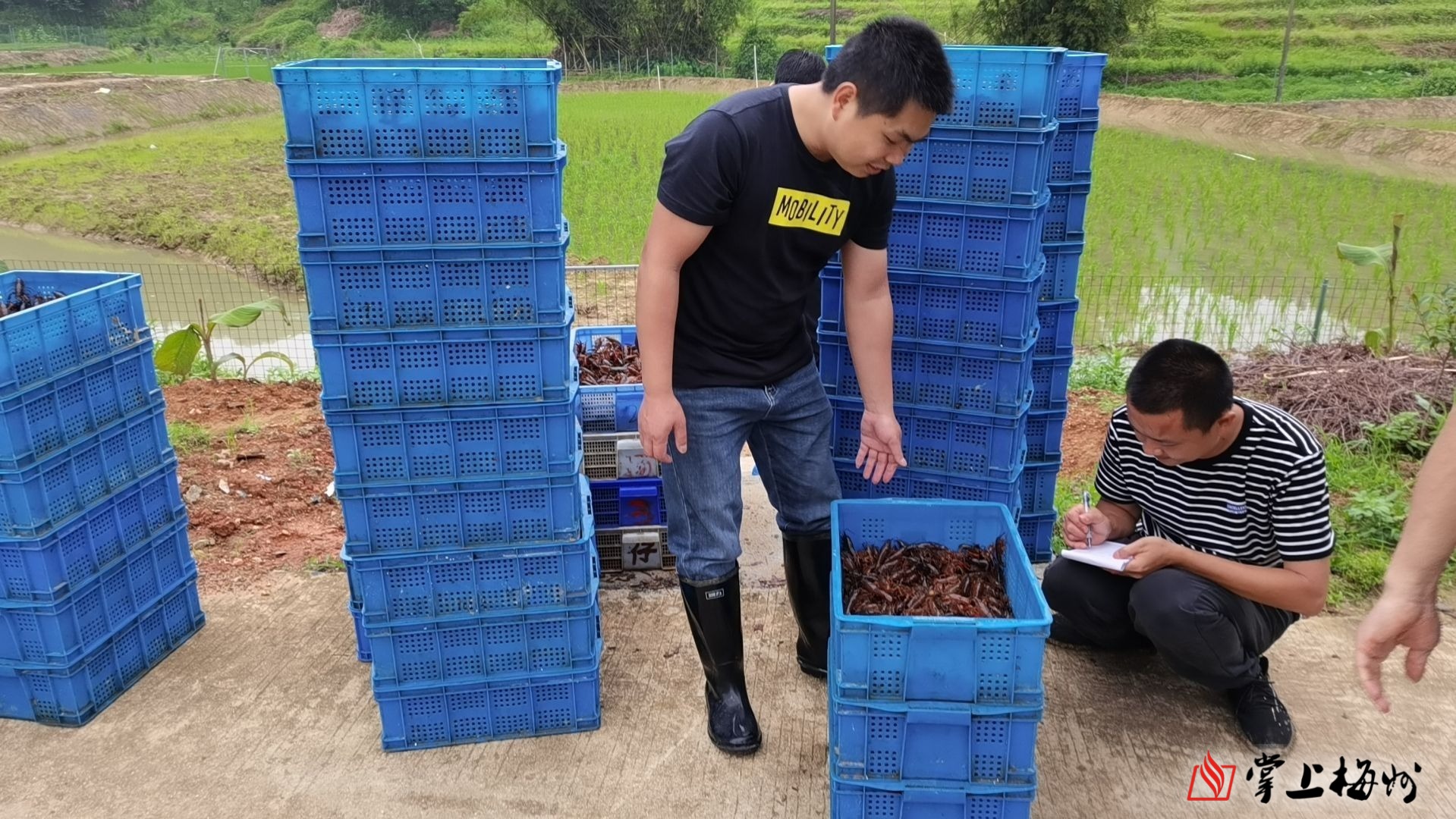 在梅县区石坑镇礤岭村稻虾共生示范基地,工作人员正在将一筐筐小龙虾苗投入眼前的这片稻田中,田里的巨型水稻长势喜人,随着小龙虾苗的投入,一幅超级水稻和小龙虾和谐共生的风景画跃然纸上。
