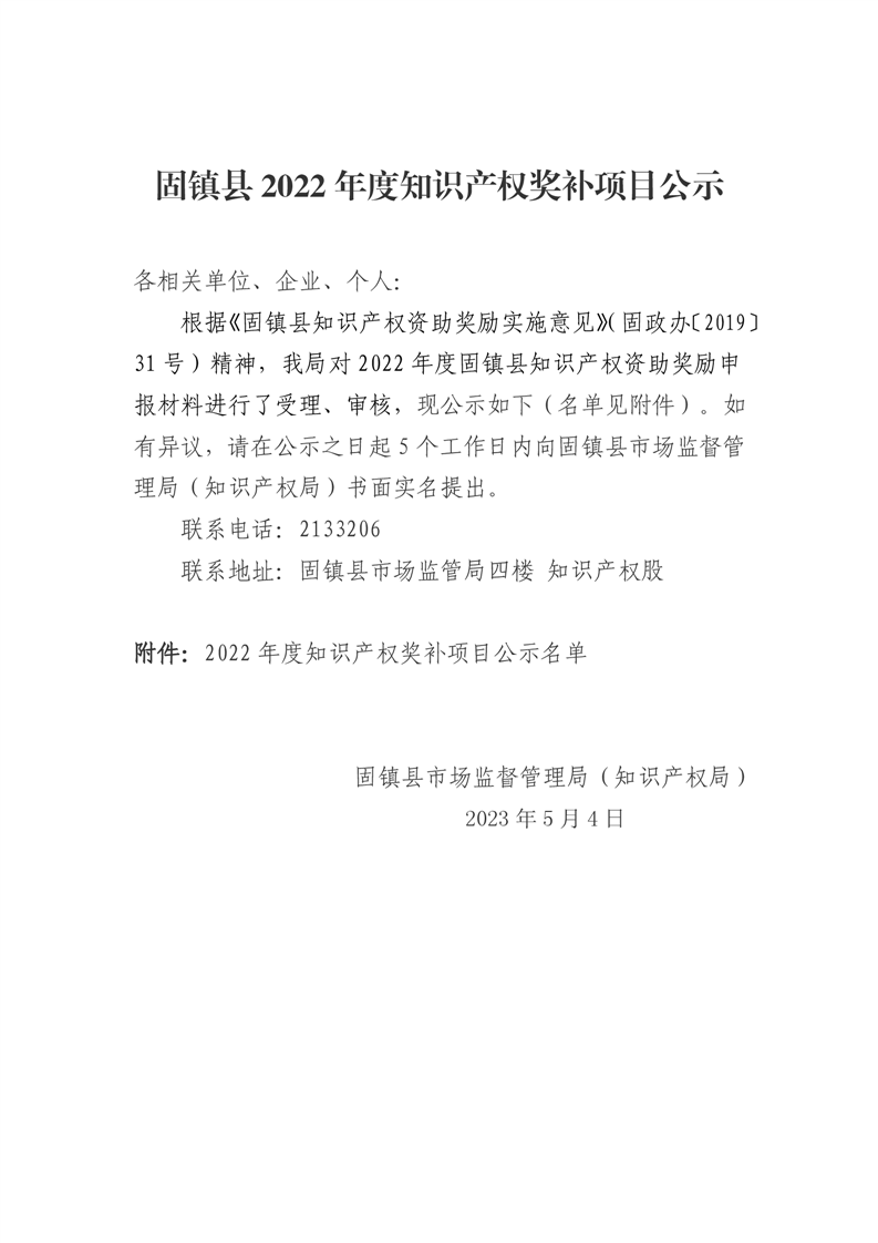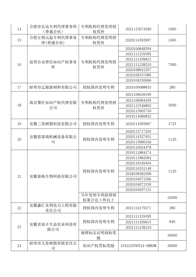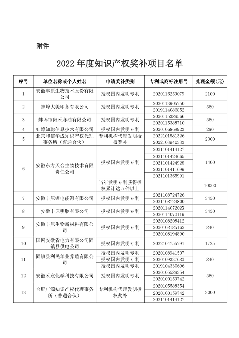 固镇县2022年度知识产权奖补项目公示