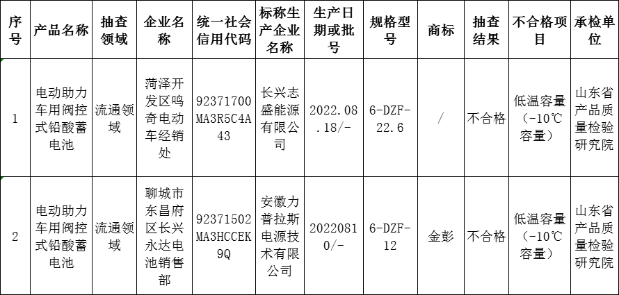 销售者分别为:菏泽开发区鸣奇电动车经销处、聊城市东昌府区长兴永达电池销售部‘不合格项目为低温容量(-10℃容量)。