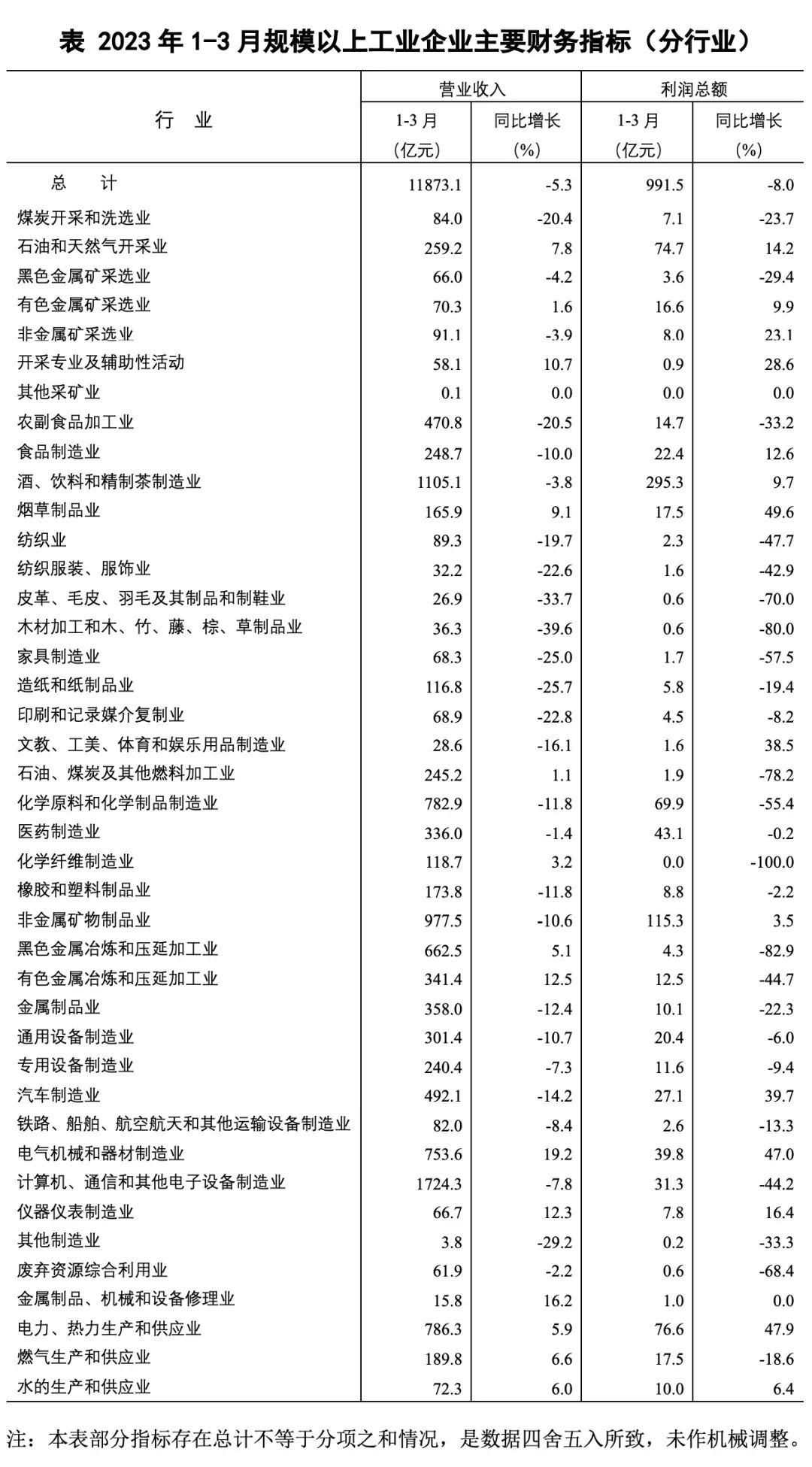 二、规模以上工业企业利润总额、营业收入等指标的增速均按可比口径计算。报告期数据与上年所公布的同指标数据之间有不可比因素,不能直接相比计算增速。其主要原因是:(一)根据统计制度,每年定期对规模以上工业企业调查范围进行调整。每年有部分企业达到规模标准纳入调查范围,也有部分企业因规模变小而退出调查范围,还有新建投产企业、破产、注(吊)销企业等变化。(二)加强统计执法,对统计执法检查中发现的不符合规模以上工业统计要求的企业进行了清理,对相关基数依规进行了修正。(三)加强数据质量管理,剔除跨地区、跨行业重复统计数据。