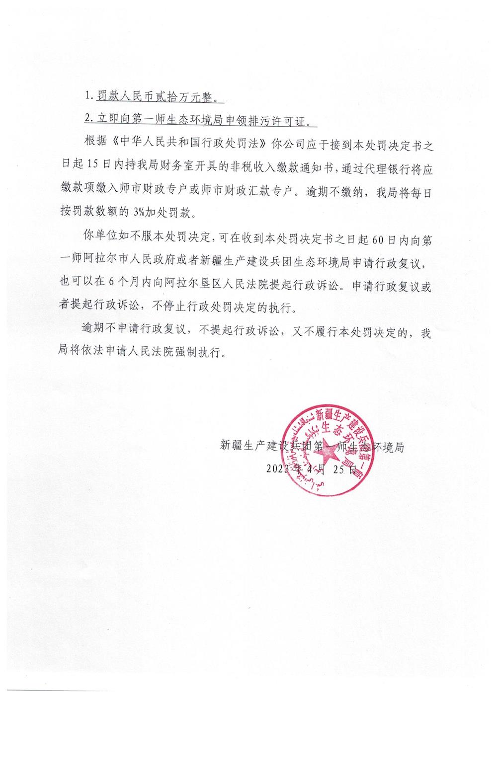关于新疆生产建设兵团第一师阿拉尔市二团城镇管理服务中心《行政处罚决定书》的公示