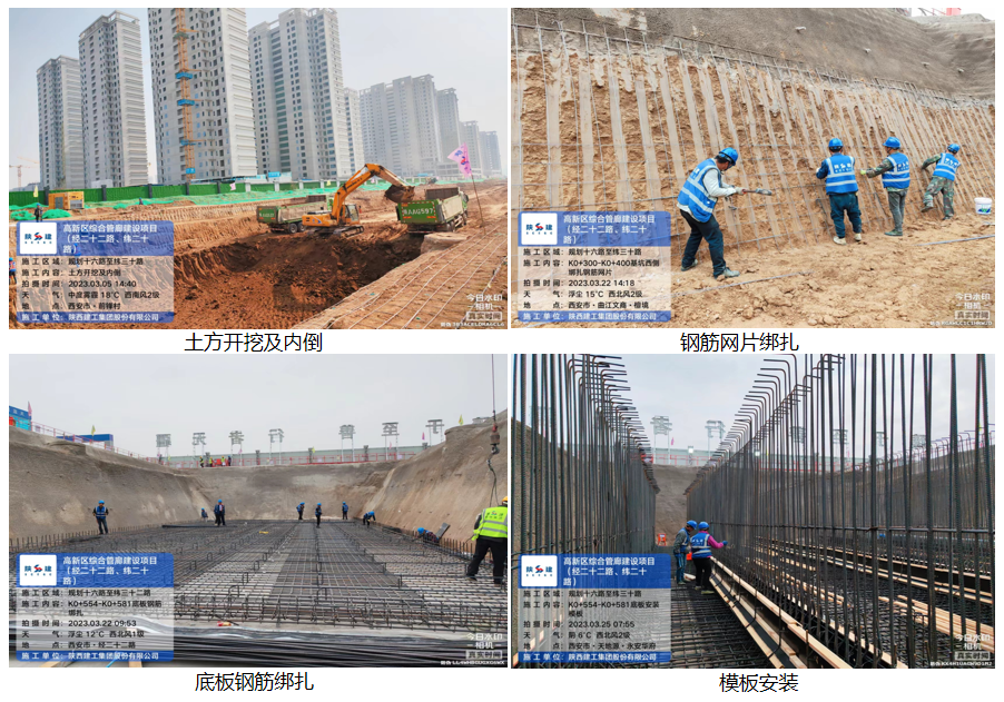 本工程位于西安市高新区,管廊成“L”型布置,分别为经二十二路管廊和纬二十路管廊,管廊全长3871.61m。经二十二路管廊呈南—北走向,南起纬三十二路,北至纬二十路,位于二十二路中央分隔带及机动车道下(道路红线宽度约60m),管廊长度1384.62m,设计为四舱混凝土框架结构。纬二十路管廊呈东—西走向(沿地铁15红线方向),西起经四十四路,东至经二十二路,位于道路北侧机动车道、非机动车道、侧分带、人行道及路侧绿化带下,长度2487m,设计为三舱、四舱混凝土框架结构。