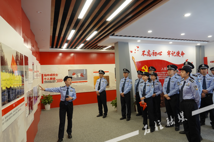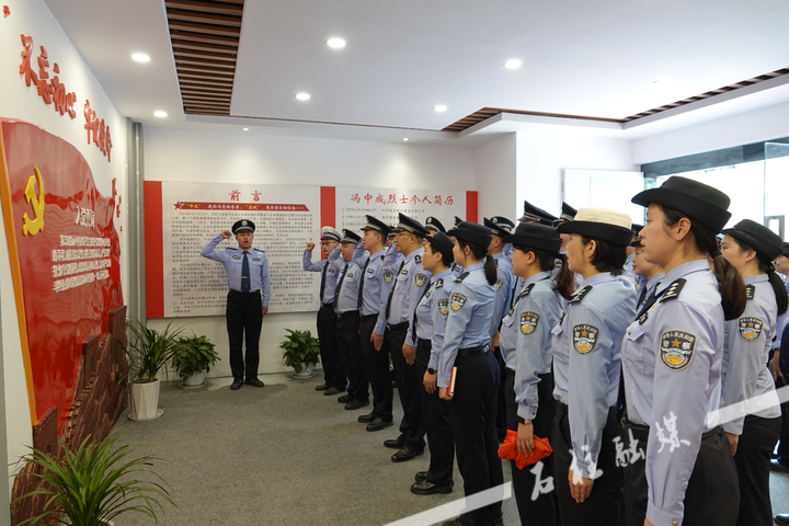 来到冯中成同志先进事迹陈列室,青年民警代表整齐列队,庄严肃立,深切缅怀冯中成烈士。在讲解员的介绍下,大家观看了冯中成同志生前工作、学习、生活的珍贵图片和实物资料,并重温了入警誓词。