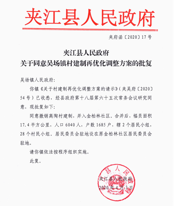 夹江县人民政府关于同意吴场镇村建制再优化调整方案的批复