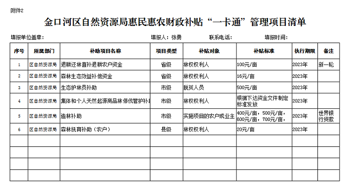 区自然资源局惠民惠农财政补贴"一卡通”管理项目清单