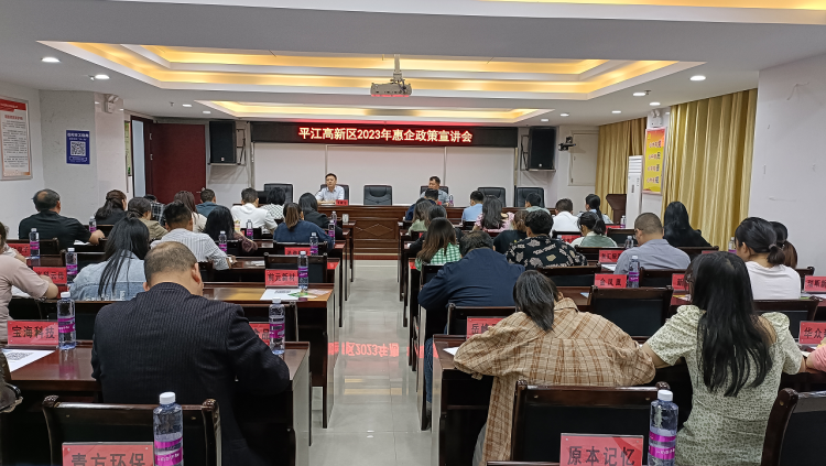 为进一步优化营商环境,切实做好涉企政策宣传和企业服务工作,推动各项惠企助企政策在高新区落地落实,5月6日上午,平江高新区举办了惠企政策宣讲会,会议由园区纪委书记江治主持,县发改局、县人社局、县税务局、县科工信局、县优化办等部门负责同志逐一解读各项惠企政策,园区85家“规上”企业负责人及财务人员共计100人参加宣讲会。