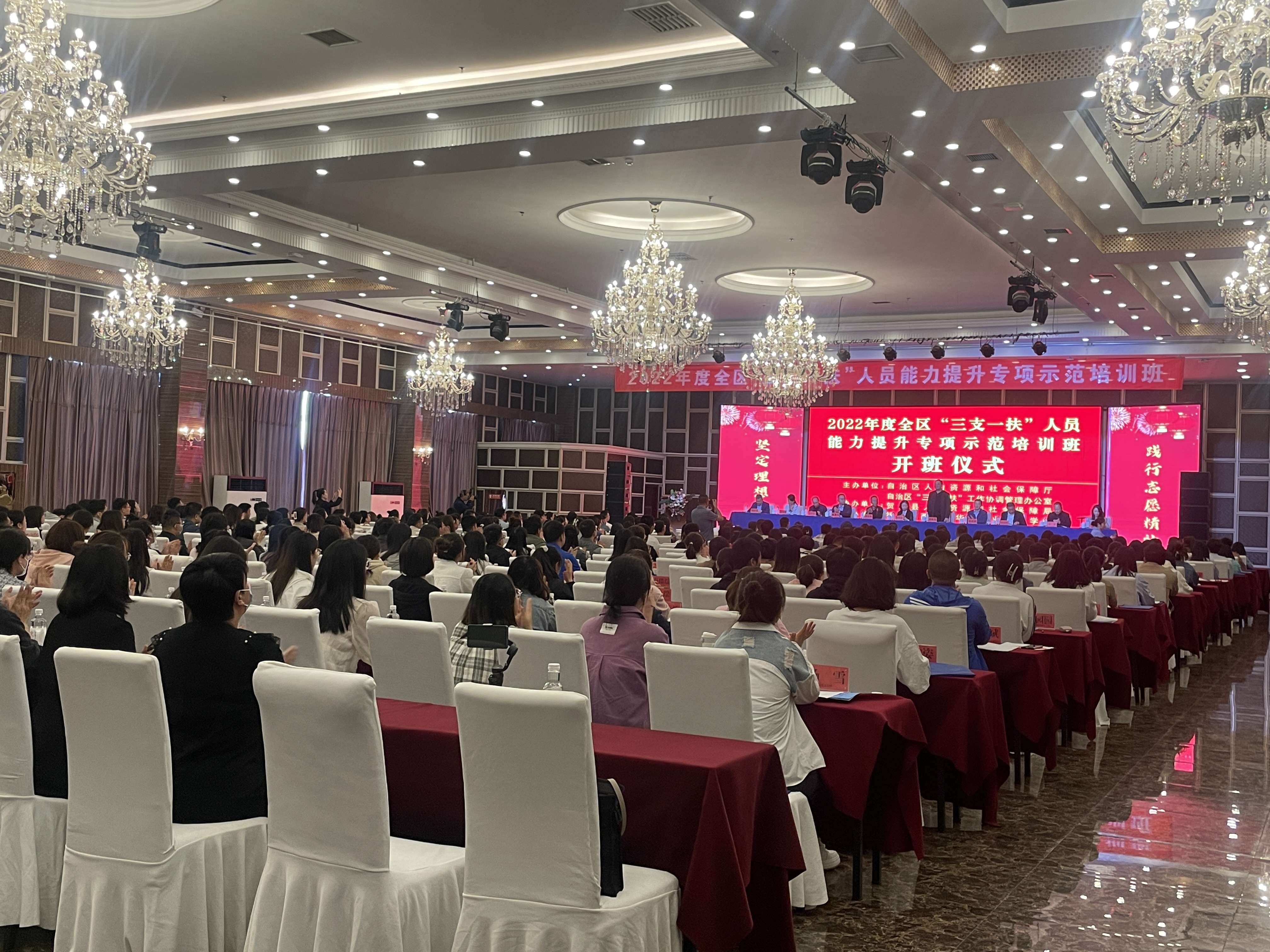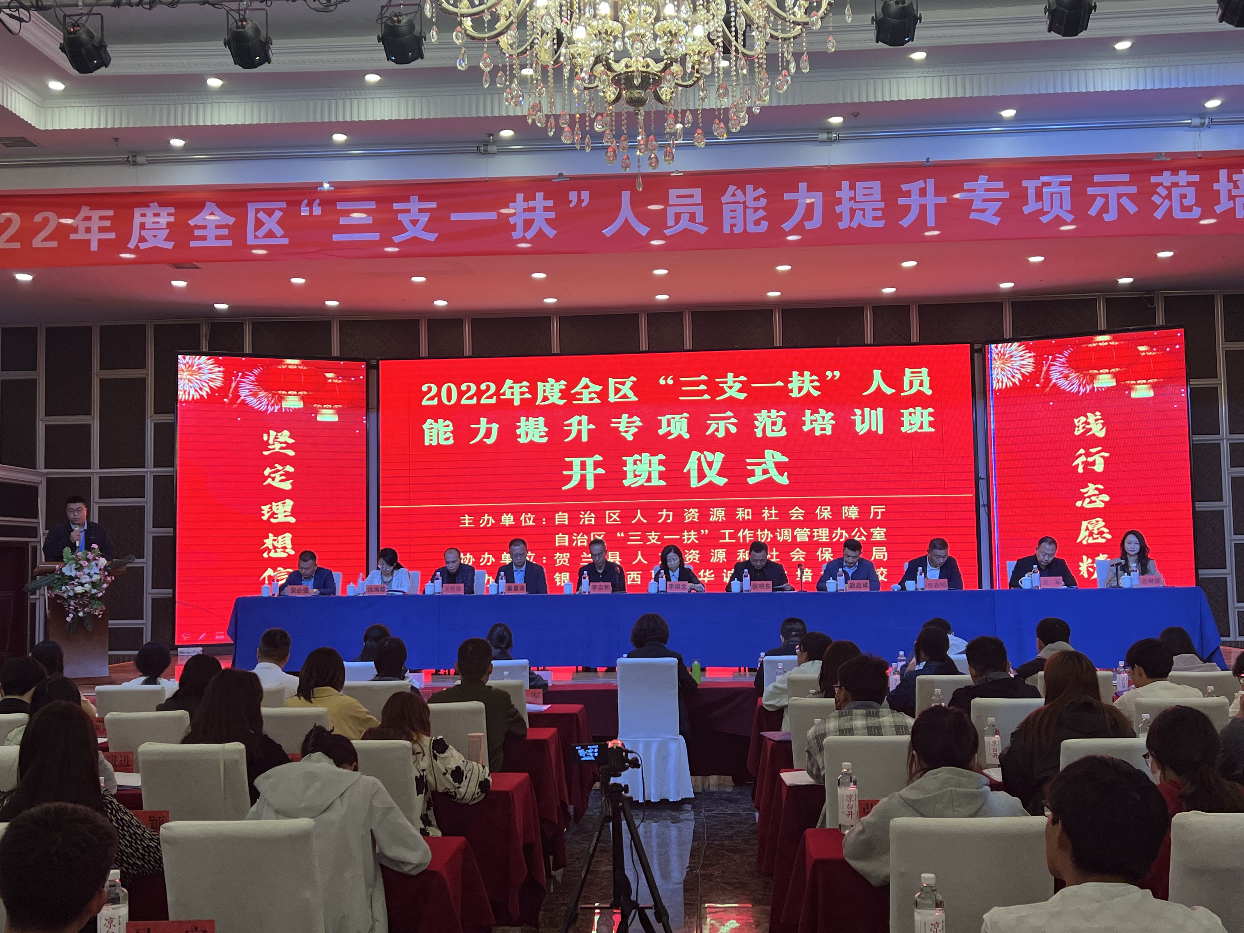 5月22日上午,2022年度全区“三支一扶”人员能力提升专项示范培训班在贺兰县国际饭店举行。自治区党校副校长李培文、自治区人力资源开发服务中心主任侯晓东、贺兰县人民政府副县长李宗怀、自治区人社厅人力资源流动管理处处长赵启斌、自治区就业与创业服务局局长翟嘉涛、银川市就业与创业服务中心主任龙军、贺兰县人力资源和社会保障局局长池海霞和全区2021年招募的“三支一扶”优秀代表参加开班仪式。