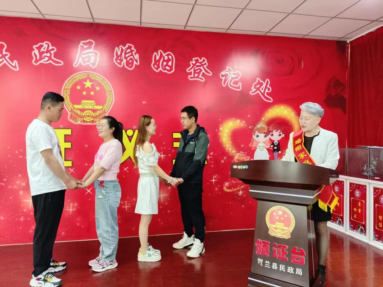 ????5月20日当天共办理结婚登记77对,“全市通办”12 对、“区内通办”10 对,合格率100%,满意度100%。今后,贺兰县民政局婚姻登记处将继续以优质高效的服务,为新人送上真挚的祝福,增强服务效能。