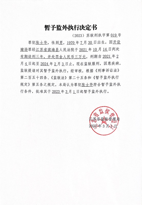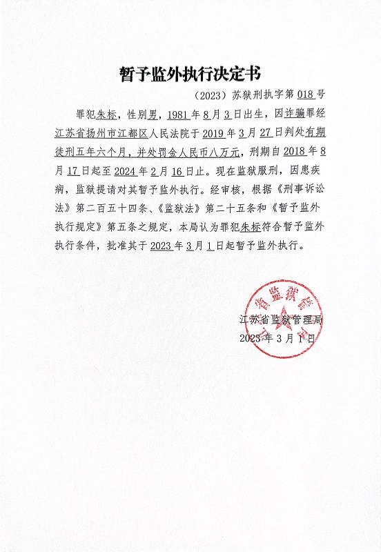 暂予监外执行决定书(2023)苏狱刑执字第018-019号