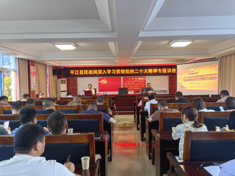 随后,局机关党委专职副书记李淼源授题为《以党的二十大精神研判新时代民政工作面临的机遇和挑战》的专题党课,引导干部职工全面领悟党的二十大精神中涉及民政工作的精髓,分析研判民政事业面临的问题挑战,号召大家坚持用党的先进理论来推进平江民政高质量可持续发展。