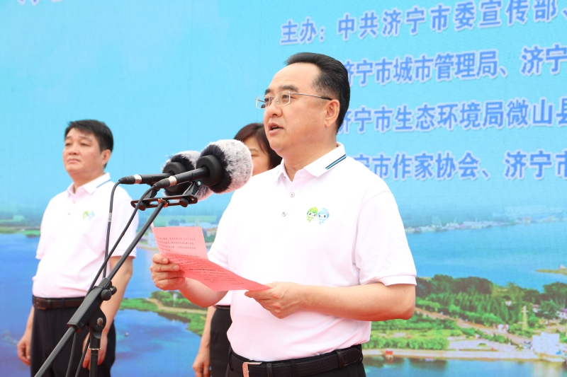 在活动仪式上,与会领导为第二批济宁市环保设施向公众开放单位授牌;为第五批济宁市“最美绿色家庭”代表颁发证书;为济宁市“变废为宝”手工作品大赛和优秀生态环保作文获奖青少年及组织工作先进个人颁奖;微山湖旅游发展集团董事长张九洲宣读了《协同推动济宁市生态环境高水平保护和经济高质量发展》倡议书;启动了“行走美丽运河,抒写绿色发展”文艺采风活动,市文联主席张作昌为文艺采风团授旗;举行了2023年山东省生态环境厅“海、湖、河‘放鱼养水’联袂行动”济宁南四湖专场活动,“放鱼养水”对改善生物多样性、净化水质具有重要意义。本次活动现场共人工放鱼10万余尾,可以增加水生生物的数量和种类,维护生物多样性,促进水域生态平衡,起到改善水质的作用。 王宏伟在讲话时指出,我市正处于争先进位和高质量发展的关键时期,全市上下要在市委、市政府的坚强领导下,树牢“绿水青山就是金山银山”发展理念,聚焦聚力绿色低碳高质量发展先行区建设,全力推动黄河流域、南四湖生态保护和高质量发展,持续深入打好蓝天、碧水、净土保卫战,以生态环境高水平保护推进经济社会高质量发展,让蓝天白云成为常态、绿水青山触目可及。 市直有关部门负责人,各县(市、区)生态环境分局主要负责人,全市生态环保工作人员、环保网格员、环保志愿者代表,重点工业企业代表,济宁市最美绿色家庭代表,济宁市“变废为宝”手工作品大赛和优秀生态环保作文获奖青少年及组织工作先进个人获奖代表,市文联、市作协有关方面代表,微山县干部群众代表等参加活动。