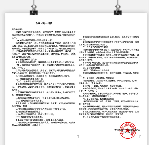 携家长共护。在校学习要注意科学用眼,呵护眼睛,在家亦是如此,因此,学校通过《致家长的一封信》,提高家长的重视度,指导家长督促孩子呵护眼睛。
