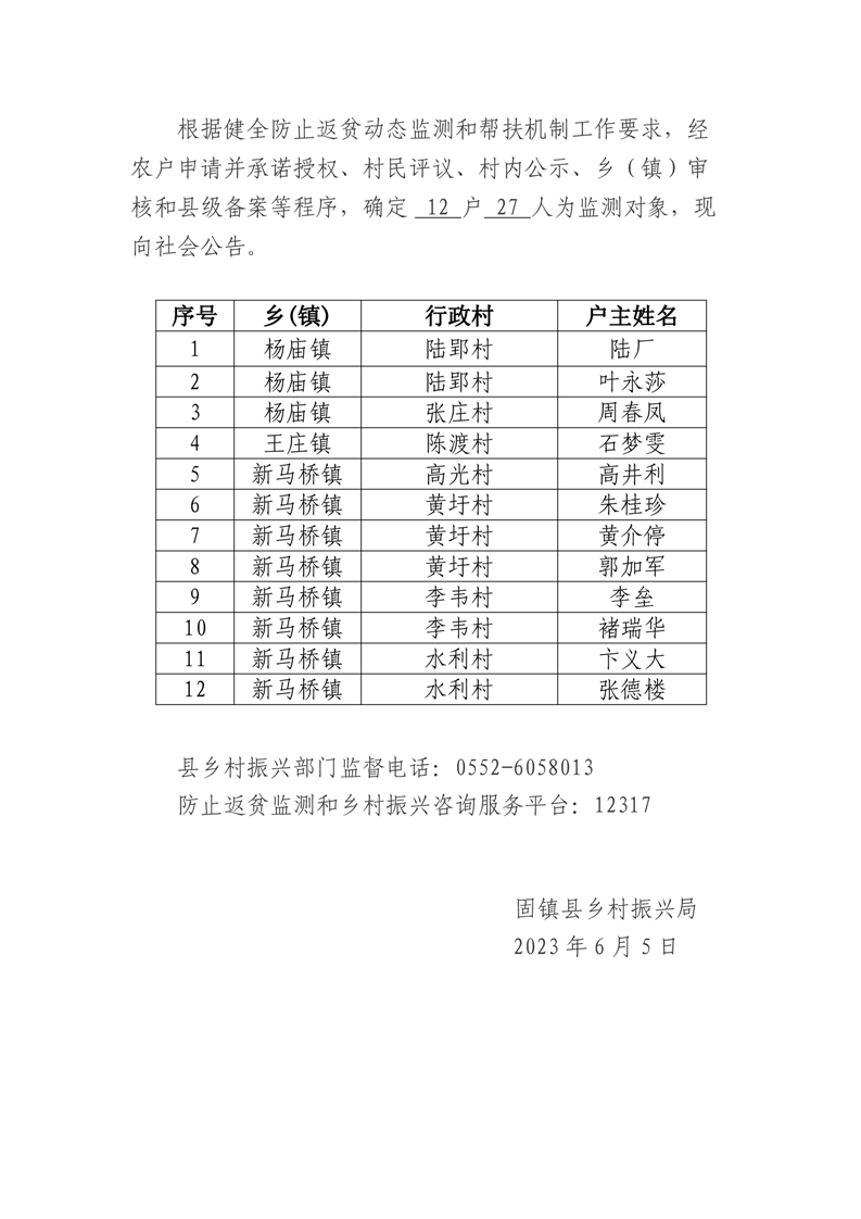 固镇县确定监测对象名单公告(第六批)