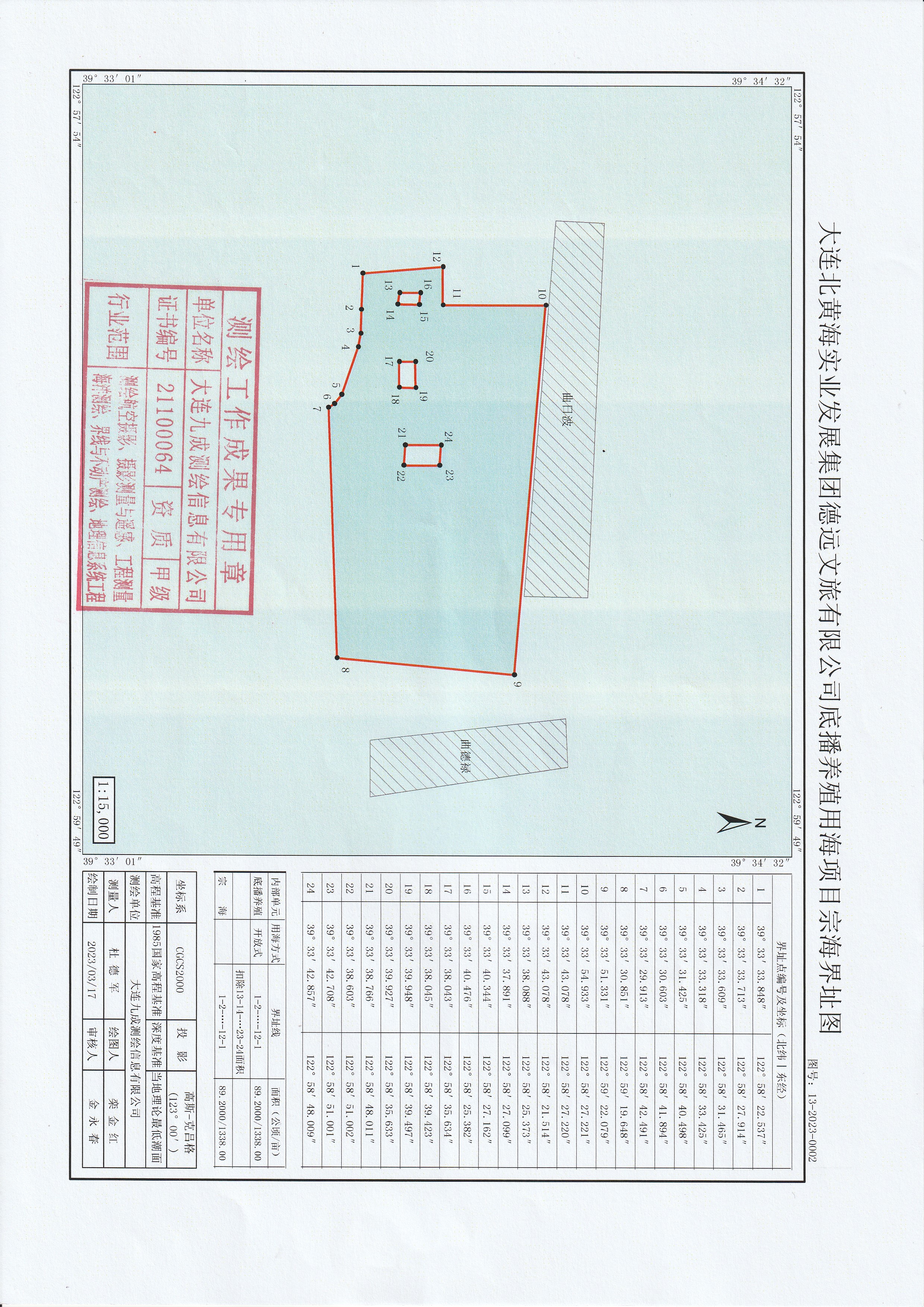 申请人:大连北黄海实业发展集团德远文旅有限公司;项目名称:大连北黄海实业发展集团德远文旅有限公司底播养殖用海项目;用海类型:渔业用海;用海方式:开放式养殖;用海位置:庄河市石城乡北部海域;用海面积:89.2公顷;拟用海期限:10年;用海范围(CGCS2000):(坐标点1-2-3-4-1连线范围内)