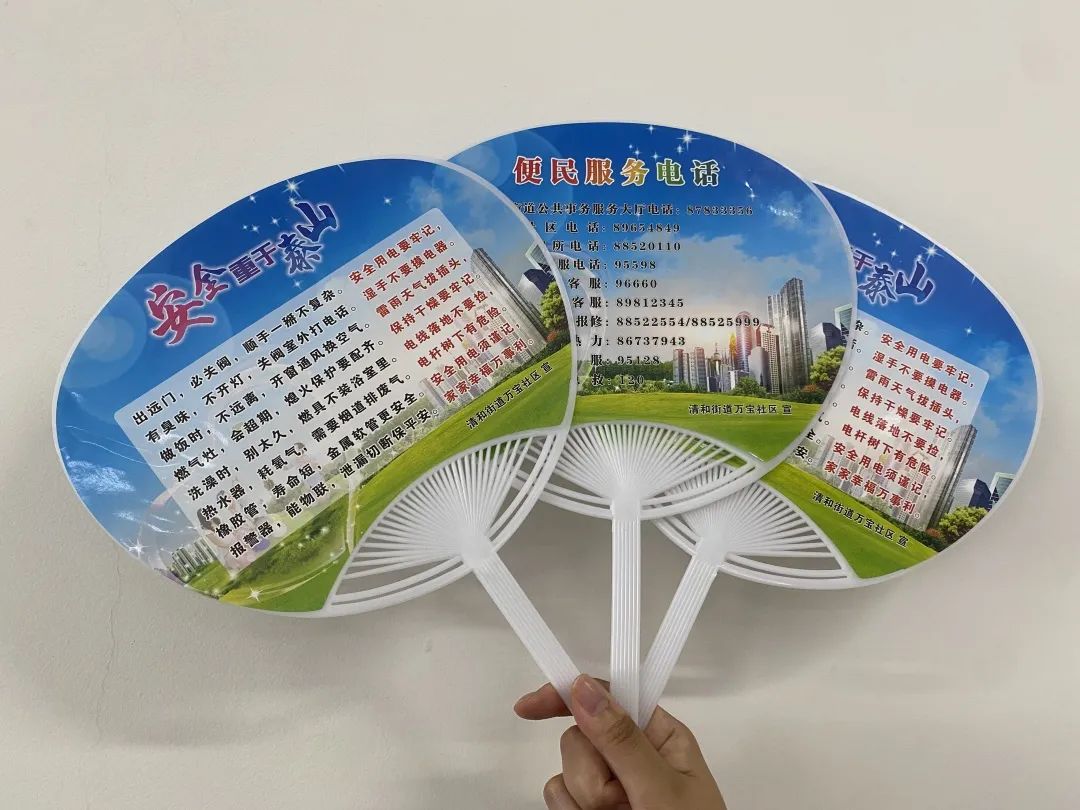 清和街道为辖区6个社区各制作1000把以安全常识为主要内容的纳凉扇,借助通俗易懂、朗朗上口的顺口溜,把安全小知识给群众说明白、讲清楚,居民拿着这把小扇子都十分喜欢。