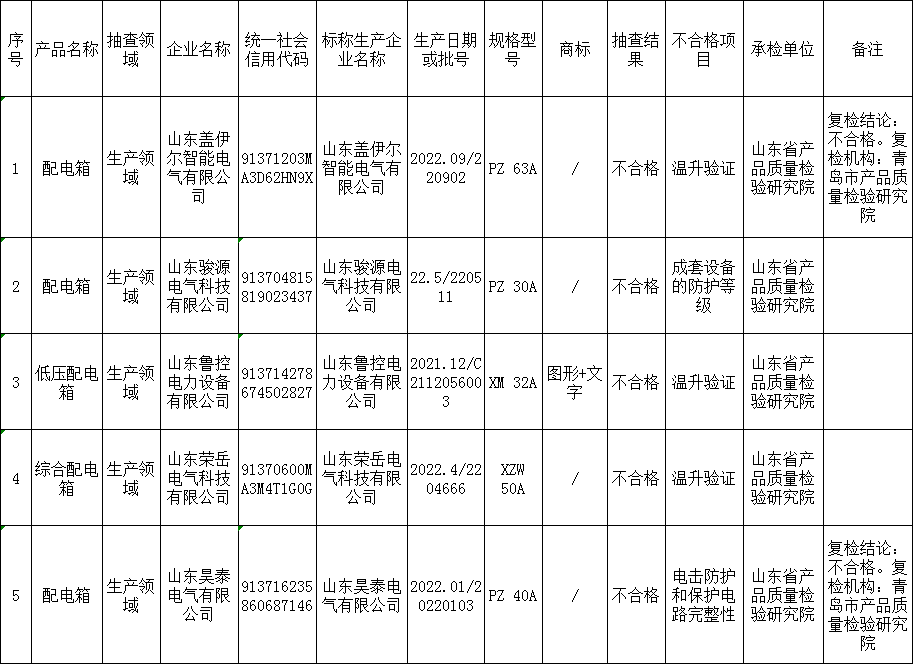 不合格产品分别抽查自:山东盖伊尔智能电气有限公司、山东昊泰电气有限公司、山东骏源电气科技有限公司、山东荣岳电气科技有限公司、山东鲁控电力设备有限公司5家生产者。