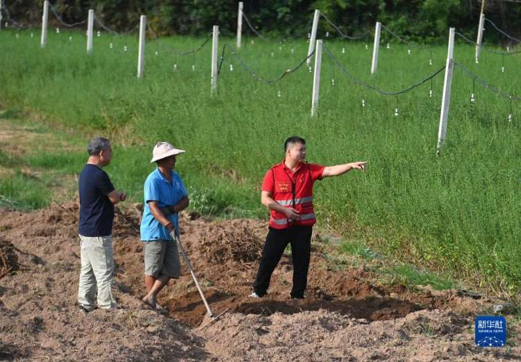 6月14日,在鹿寨县鹿寨镇窑上村,驻村第一书记荣双全(右一)在蔬菜基地查看产业发展情况