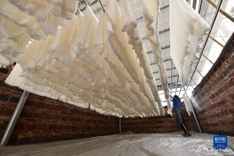 6月14日,在鹿寨县黄冕镇山脚村蚕丝被加工厂,村民在晒丝