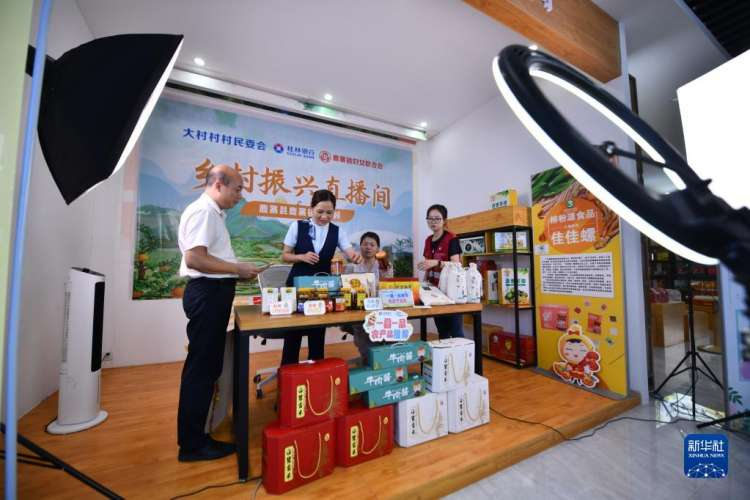 6月14日,在鹿寨县鹿寨镇大村村,村干部和村民在准备直播带货