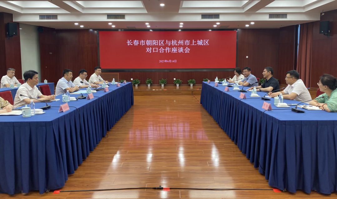 许军一行与上城区政府进行座谈交流。许军与上城区区长惠海涛分别介绍各自区域情况、发展现状,并围绕两个城区对口合作方向进行深入探讨。许军表示,朝阳区与上城区均属中心城区,是城市科技金融文化中心,有着深厚的文化底蕴和得天独厚的发展优势,两地协同联动、合作发展空间巨大。未来合作中,要进一步加快推进联动发展,深化产业对接,充分利用各自优势实现合作共赢。