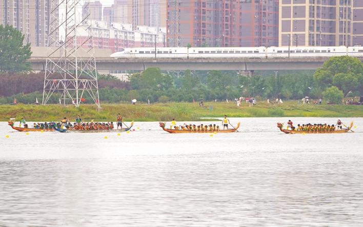 “嘿哟,嘿哟”在整齐响亮的号子声中,一艘艘“离弦的箭”掠过水面惊起浪花朵朵,争渡争渡,23支龙舟队伍铆足全力,上演一场水上速度与激情。龙舟沿着不远处地标武汉客厅方向疾驰,武孝城际铁路上驰骋的列车与龙舟“擦肩而过”,湖岸旁矗立着鳞次栉比的写字楼和繁华的商业体,让这一古老的传统与现代完美契合。