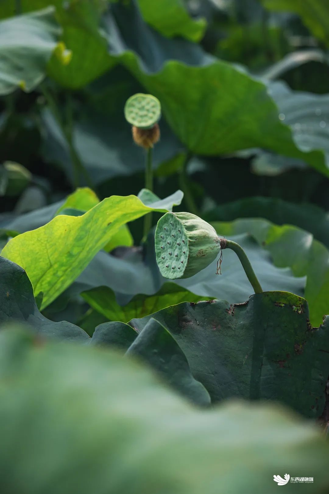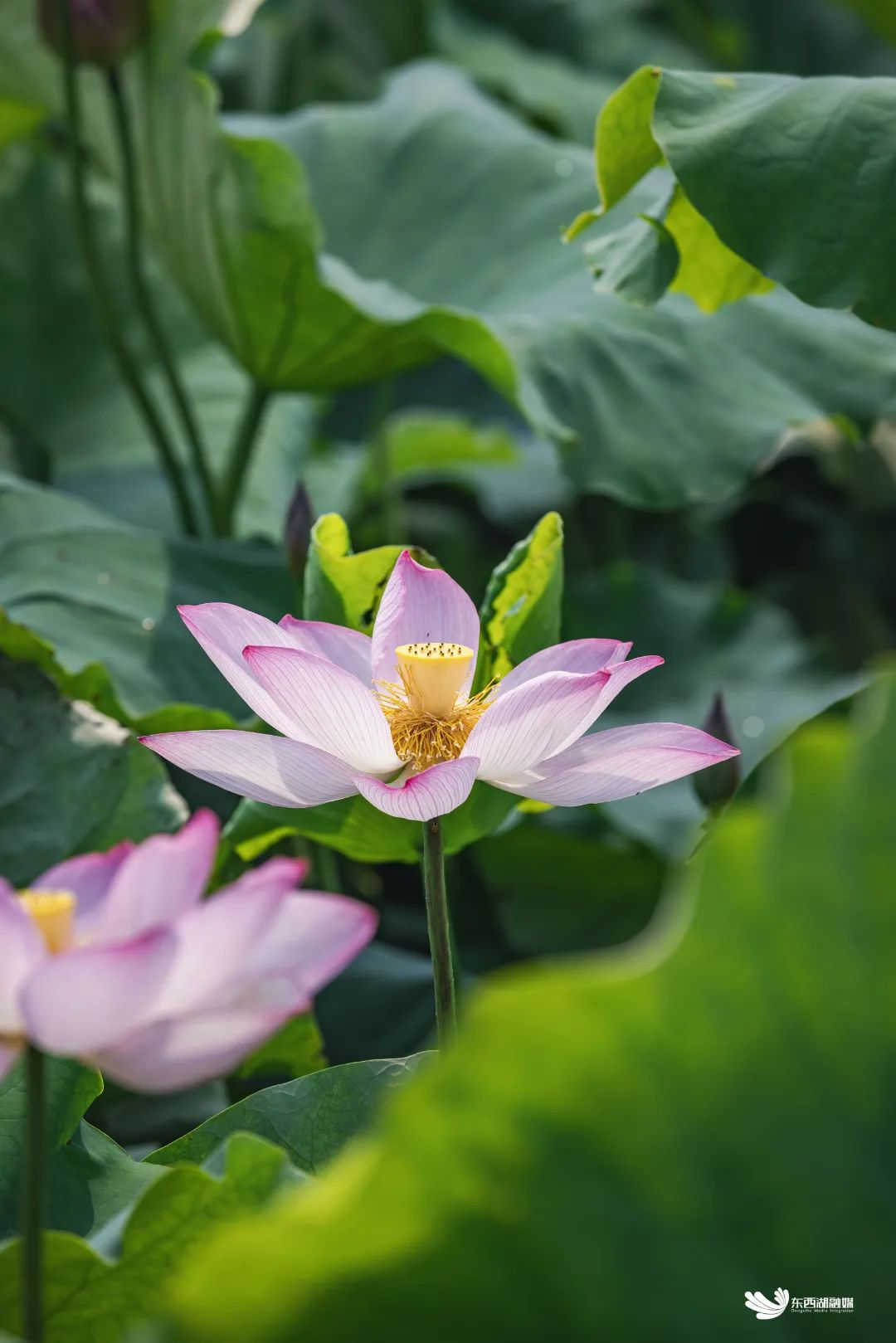 在荷塘深处,记者听见了一声清脆的鸟叫,俯身看下去,竟看到了一只红嘴水鸟带着五只水鸟宝宝在戏水,一旁的荷叶上还藏着一只小青蛙。在6月的夏天里,绽放的太空莲自成了一片生态空间。