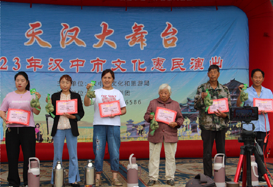 绿水青山深处,洋县茅坪镇新华村的文化大舞台上,站着一排先进人物,他们一手拿着荣誉证书,一手拿着端午节粽子,脸上喜气洋洋。台下的群众掌声雷鸣,现场热闹非凡。