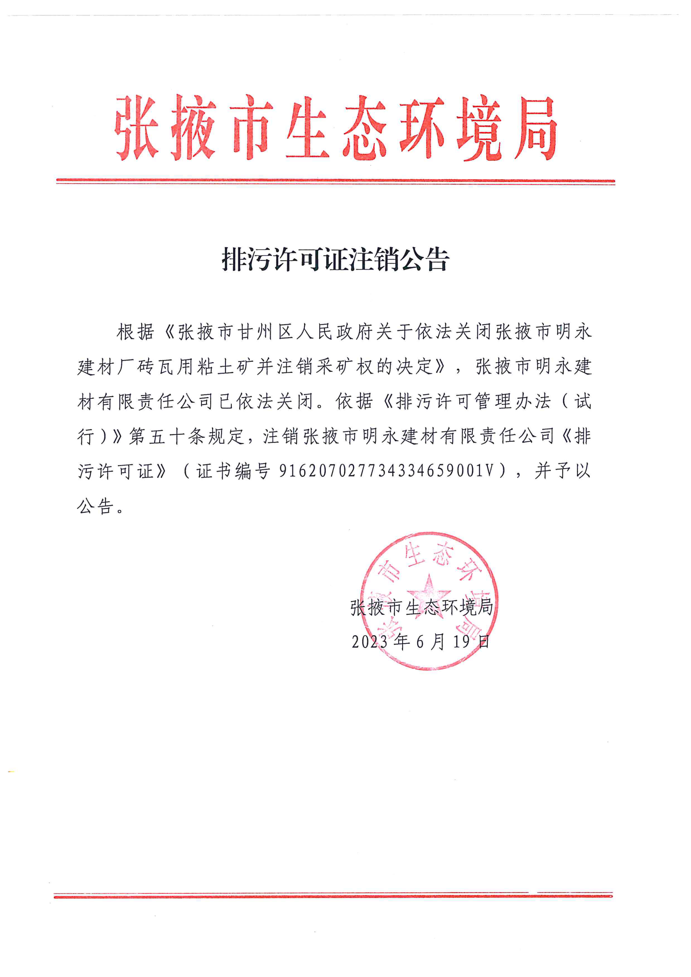 张掖市明永建材有限责任公司排污许可证注销公告
