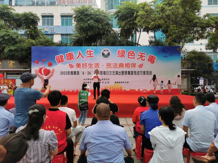 6月26日,2023年鹿寨县“6·26”国际禁毒日文艺演出暨禁毒宣传进万家活动在县城北文化广场举行,活动通过文艺演出、展板展示、悬挂横幅、发放宣传资料等多种形式,深化全民禁毒预防教育,提升广大人民群众禁毒意识,纵深推进我县禁毒工作。