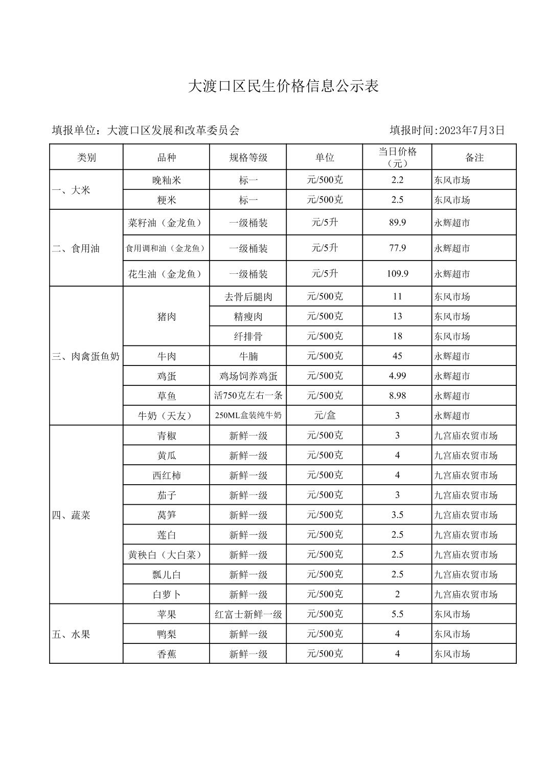 大渡口区民生价格信息公示表 2023-7-3