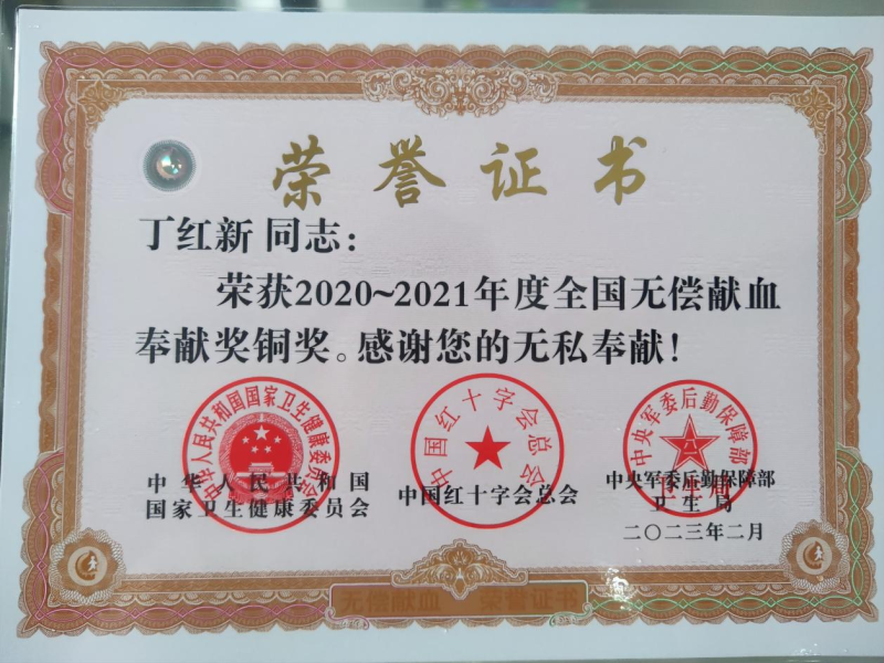 枝江融媒(通讯员 贺露)近日,国家卫生健康委员会、中国红十字会总会、中央军委后勤保障部卫生局对全国无偿献血先进单位及个人进行表彰,枝江市仙女镇烟墩包村党支部委员、村财经委员丁红新荣获2020-2021年度“全国无偿献血奉献奖”铜奖。